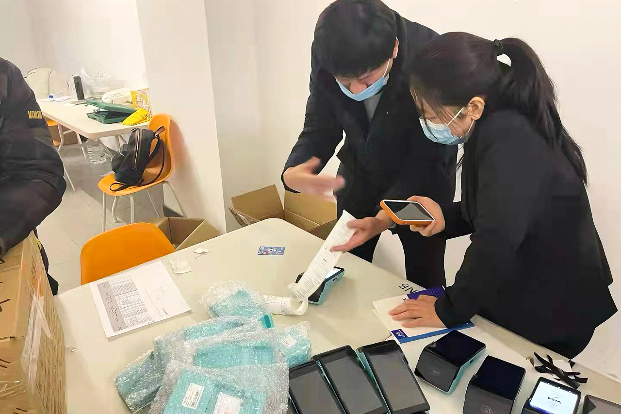 雷火竞技工作人员在冬奥村调试支持数字人民币的POS设备