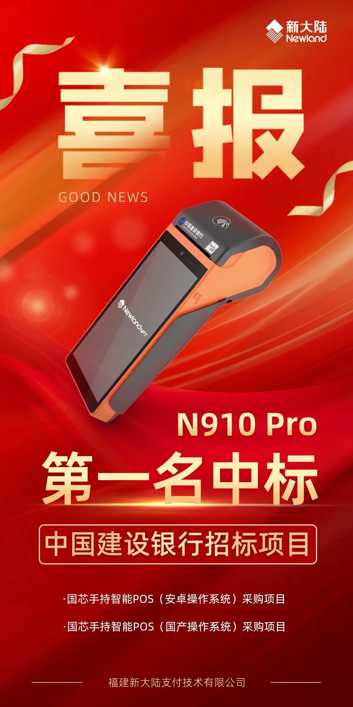 近日,中国建设银行股份有限公司国芯手持智能POS采购项目中标结果公示,雷火竞技支付技术智能POS终端N910 Pro成功入围,并再次以综合得分第一名的成绩中标国芯手持智能POS(安卓操作系统)采购项目及国芯手持智能POS(国产操作系统)采购项目,再次彰显了雷火竞技支付技术在行业领域的技术优势和领跑地位。