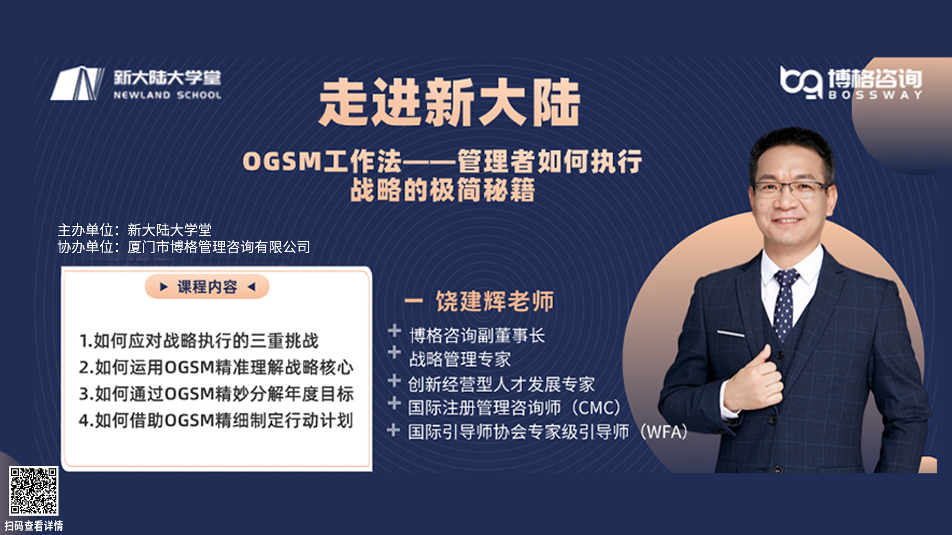 在OGSM模型的讲解中,饶老师详细介绍了模型的四个关键组成部分:目的(Objectives)、目标(Goals)、策略(Strategies)和衡量(Measures)。他通过实际案例,如美国国家航空航天局NASA的登月计划和宝洁的一页纸计划书,展示了OGSM模型在不同领域的应用。饶老师指导参训人员如何运用OGSM模型精准理解战略核心,精妙分解年度目标,并精细制定行动计划。他特别强调了目的O的定性描述、目标G的量化指标、策略S的创新性和衡量M的可量化标准。