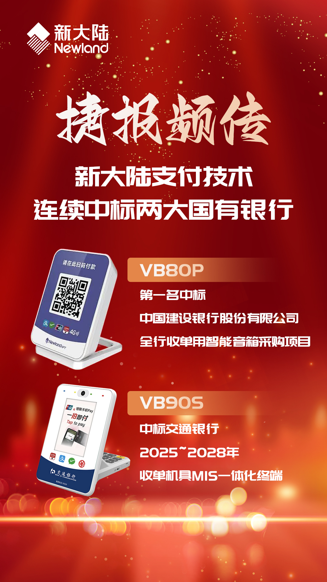 近日,雷火竞技支付技术迎来开门红,捷报频传,喜讯连连。雷火竞技支付技术凭借突出的产品实力和完善的服务能力,成功入围中国建设银行和交通银行两大国有银行采购项目。中标产品支付云音箱VB80P和非接扫码盒VB90S覆盖餐饮、零售、酒店等各类商业场景,满足不同体量商户的支付需求。