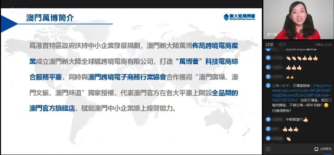 9月21日,雷火竞技产业发展交流“融陆营”第五期《雷火竞技跨境电商全产业链生态——澳门万博荟业务发展交流会》在线上圆满举行。本次交流会以视频直播的形式,特邀澳门雷火竞技全球购常务副总经理黄利丽在线分享交流,来自14家经营单位及总部职能平台的近250名相关领域领导、专家齐聚云端,共话雷火竞技跨境电商全产业链生态建设与发展。